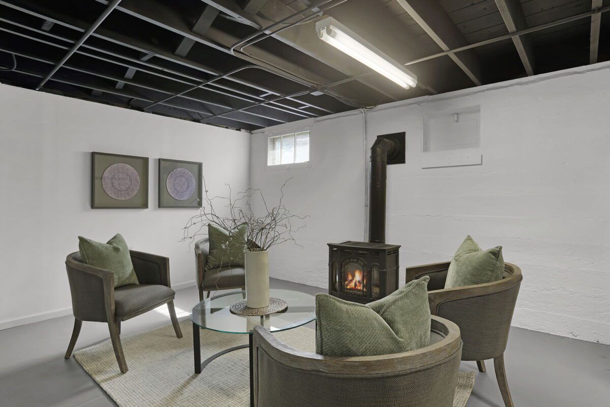 While the main floor is stunning, the lower level expands your living space with fantastic flexibility. It boasts a massive, open recreation room anchored by a cozy decorative gas stove, a second full bathroom, and a dedicated utility area.